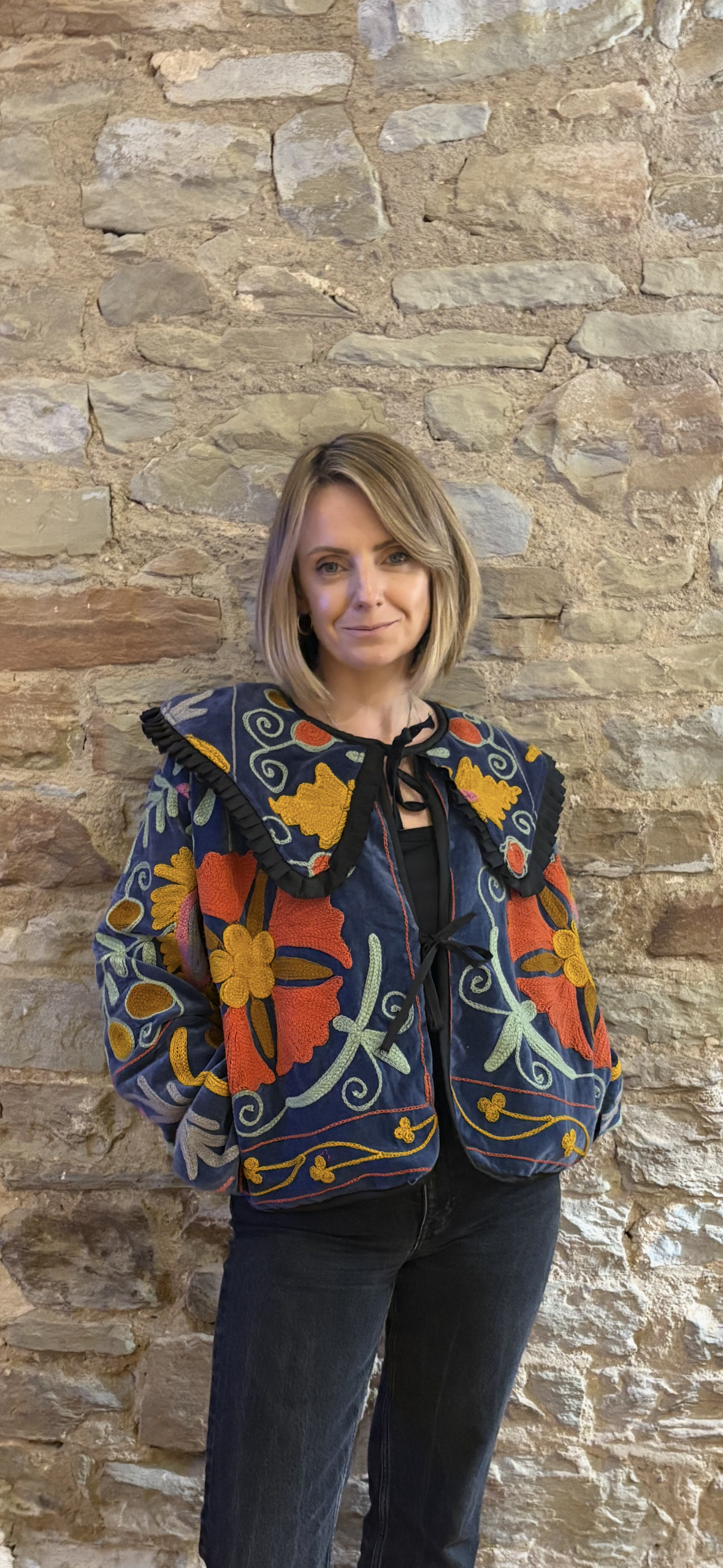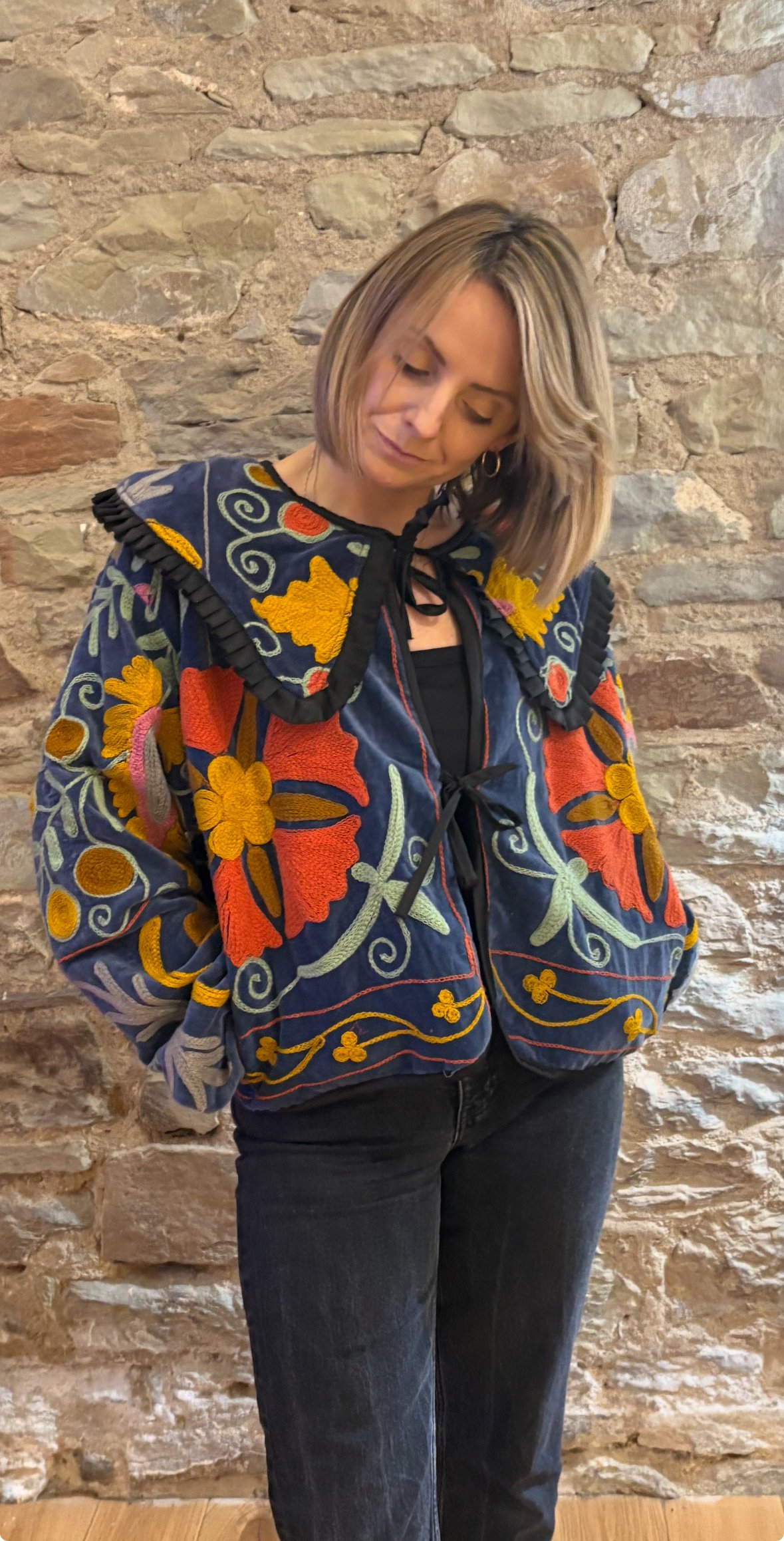 This style is available with or without a structured collar, allowing for adaptable styling across collections or customer preferences. The embroidered surface showcases intricate floral motifs in bold tones, complemented by tonal ruffle detailing and tie fastenings at the neckline. Designed for expressive wearers, the Frida jacket balances artisan craftsmanship with contemporary edge.