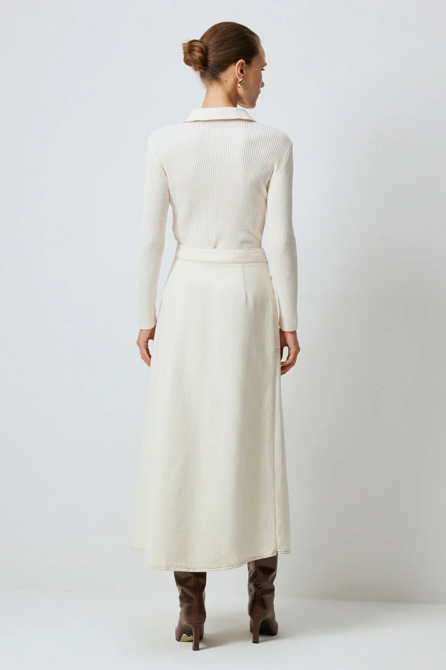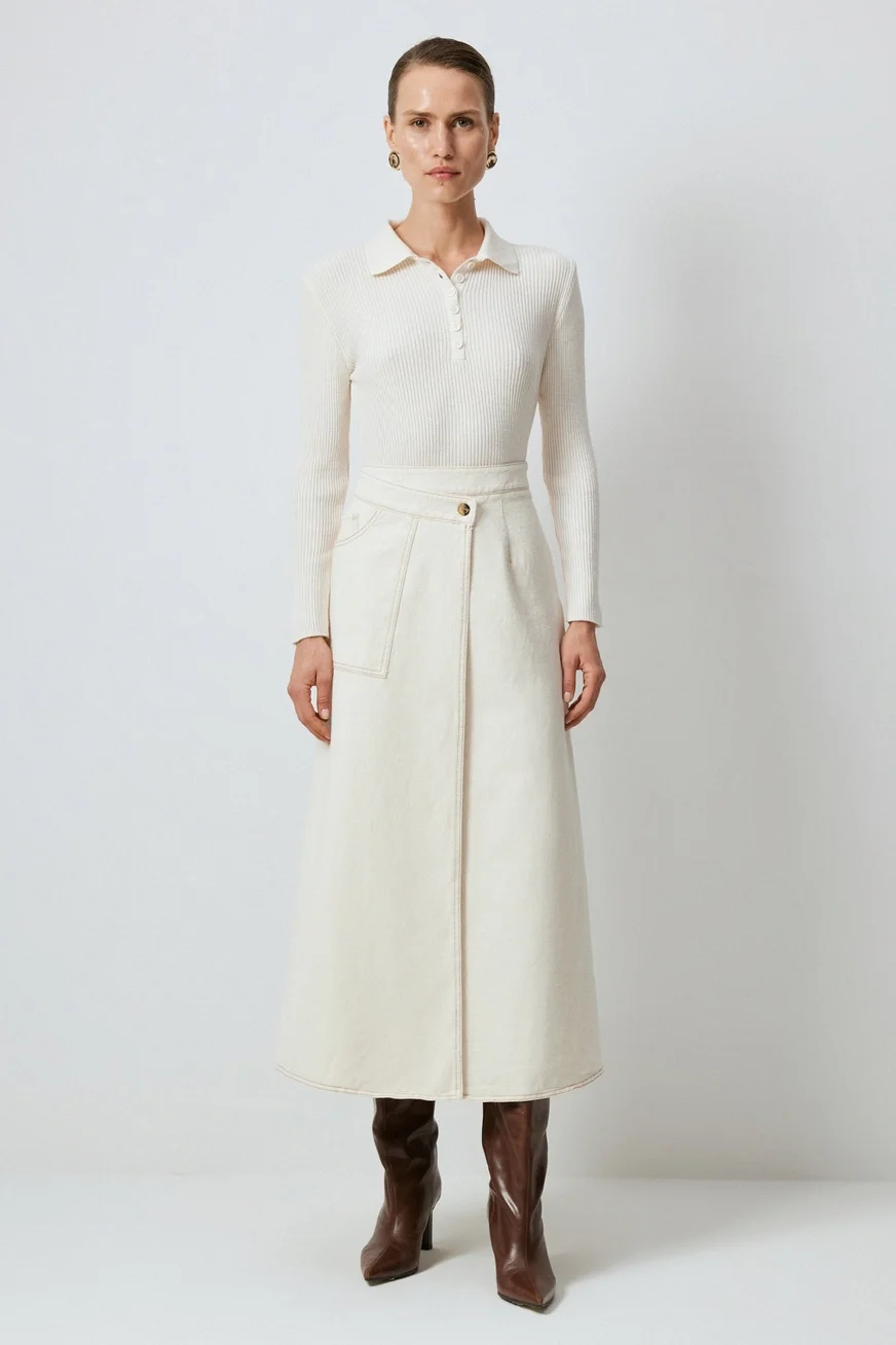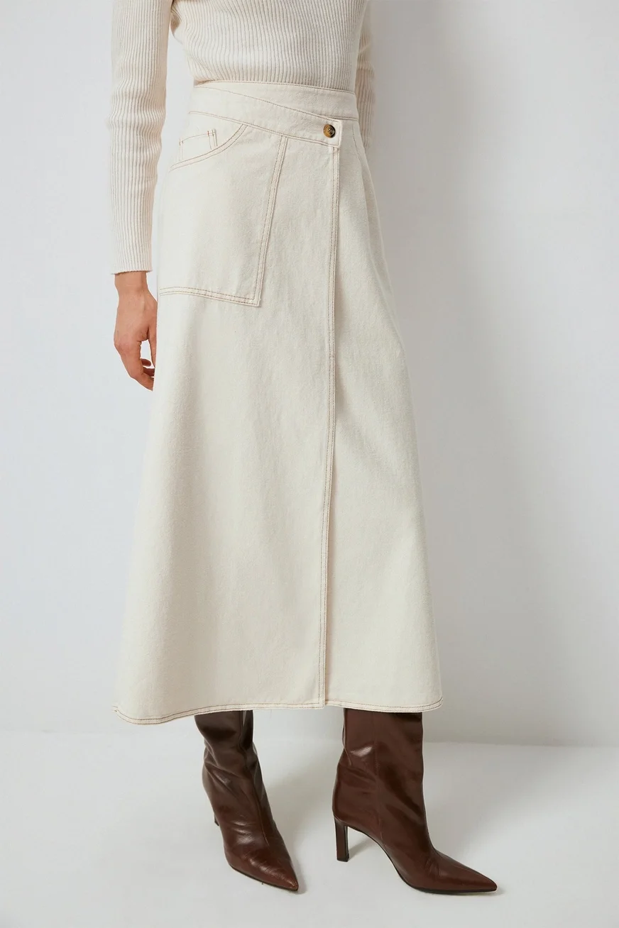 Categories: ALL KNITWEAR SKIRT DRESSES BOTTOMS SHIRT ELUNA QUILTS NAHLA AVARA SORELLE Double-Breasted Natural Denim Skirt £45.00